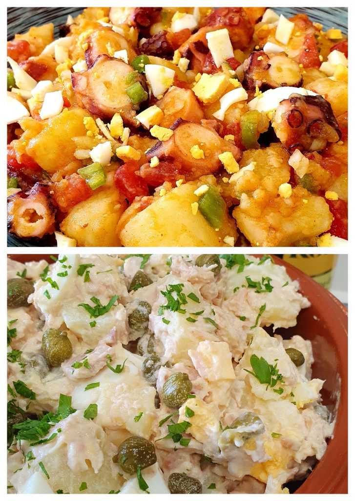 3 ensaladas de patatas SALUDABLES y muy COMPLETAS. ENSALADA DE PATATAS Y ATÚN 500 gr de patatas cocidas, 2 huevos cocidos, 3 latas de atún, Un puñado de alcaparras o aceitunas, 3 cucharadas de mahonesa, perejil.