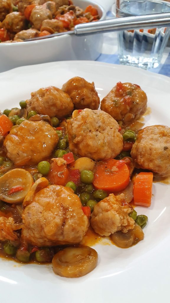 Salsa: -1 cebolla -1/2 pimiento rojo -1 pimiento verde -2 zanahorias. -1/2 vasito medidor vino blanco -1/2 vasito medidor tomate frito -1 vasito medidor caldo verduras -1 bandejas de champiñones (250 gr)