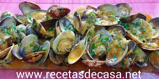COCINAEntrantes Almejas en salsa enero 31, 2019 Admin Ingredientes: 500 gr. de almejas. 1 cebolla. 2 dientes de ajo. 1 vaso de vino. 3 cucharadas de salsa de tomate frito. 1 cucharada de pimentón de la Vera (ahumado). Otro, si no tienes éste. 1 cucharada de harina. Sal, aceite y perejil. Ensaladilla rusaPatatas aliñás de Cádiz