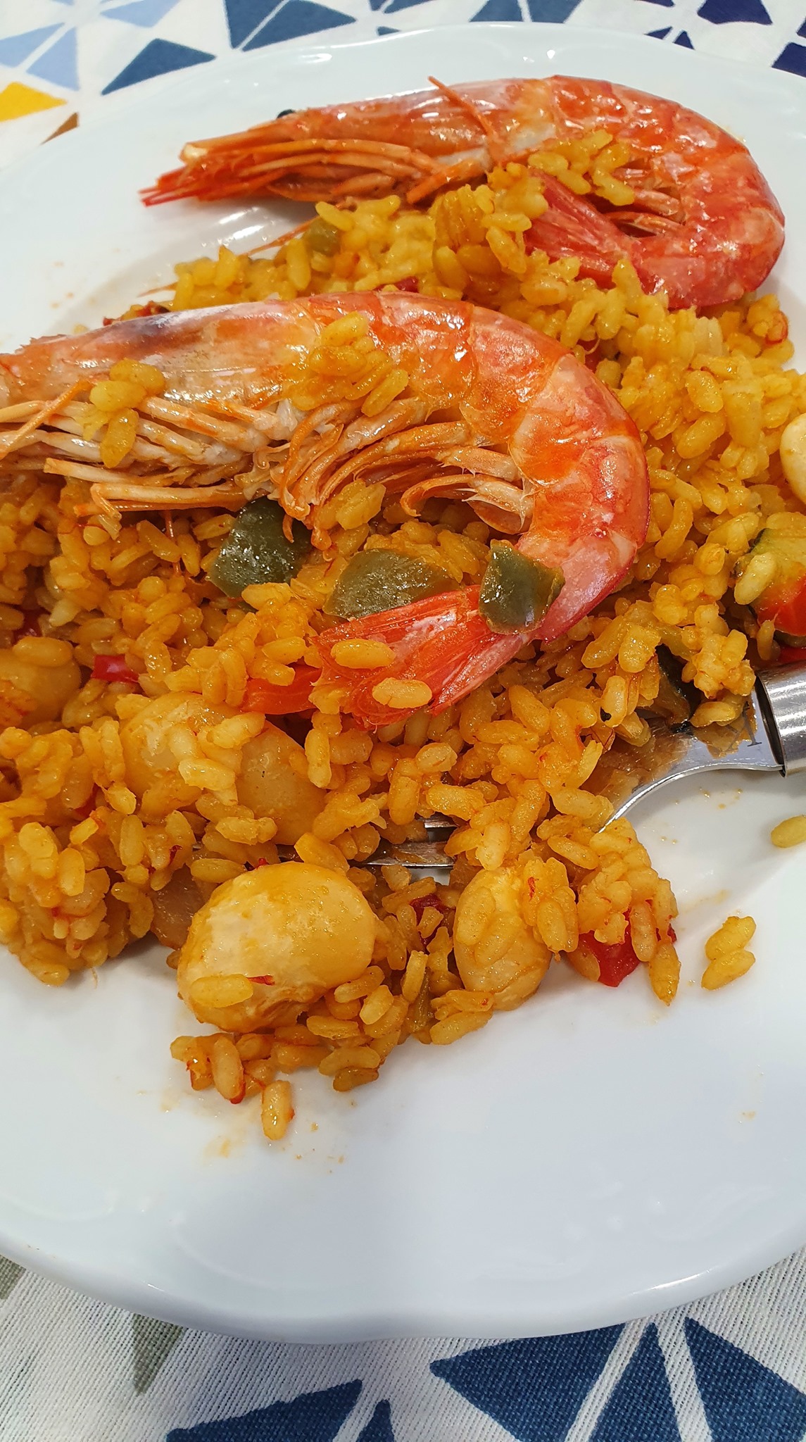 ARROZ EXPRESS con verduras y gambones / Ingredientes: 360 gr. de arroz, 8 gambones, 400 gr de preparado de verduras (pimiento rojo, pimiento verde, cebolla, calabacín y puerro), 2 tomates, 1 pimiento choricero, 150 gr. de garrofón, 1 litro de caldo, Pimentón, azafrán, aceite de oliva y sal.