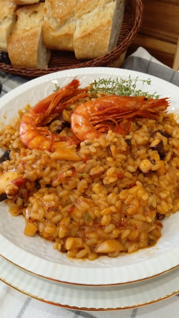 ARROZ MELOSO de pulpo y sepia con gambas. Ingredientes: 500 gr de sepia, 250 gr de pulpo cocido, 8 gambas, 1/2 pimiento rojo, 1/2 pimiento verde, 1 cebolla tierna, 1 diente de ajo, 2 tomates de pera, 1 pimiento choricero, Unas hebras de azafrán, 320 gr de arroz redondo, 1250 ml de fumet o caldo de pescado, 50 ml de aceite de oliva, sal.