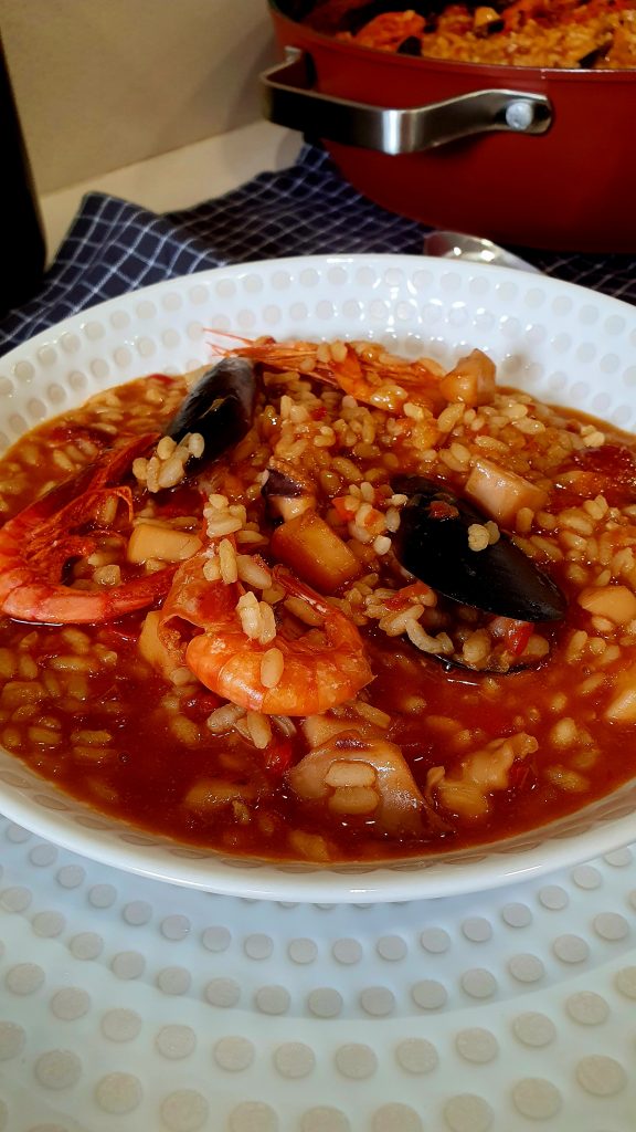 ARROZ MELOSO de sepia y gambas !!!! Ingredientes: 360 gr. de arroz redondo, 1,5 litros de fumet o caldo de pescado, 1 sepia grande, 200 gr de gambas pequeñas, 12 mejillones, 1/2 pimiento rojo, 1 cebolla y 1 diente de ajo, 2 tomates de pera, 1 pimiento choricero, Unas hebras de azafrán, una cucharadita de pimentón, Aceite de oliva y Sal.