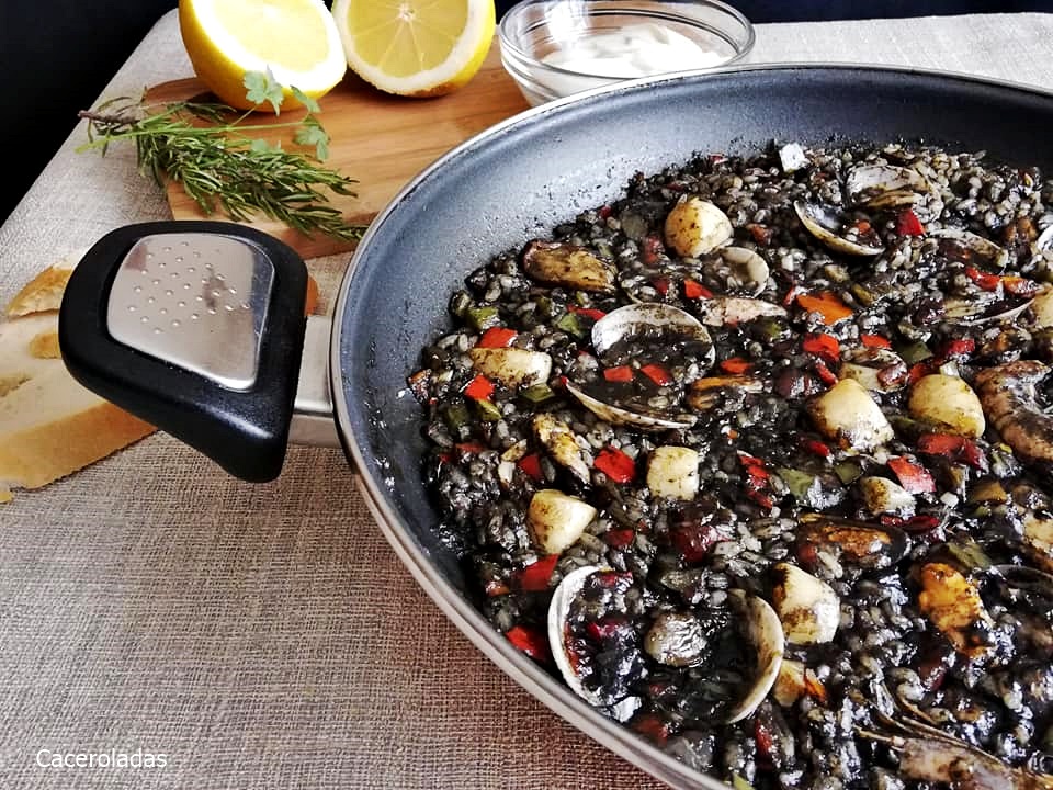 Delicioso arroz negro con pescado y marisco. Un plato sabroso y nutritivo, que se prepara de manera fácil. Una de las recetas mas deliciosas y tradicionales de nuestra gastronomía. Este arroz negro, es una versión de típico «arroz negro valenciano o arrós negre» que podemos disfrutar en muchos restaurantes de la zona del mediterráneo.