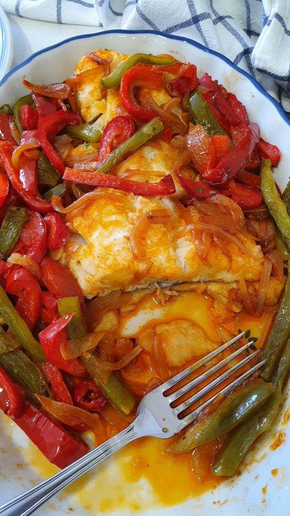 Bacalao a la portuguesa con pimientos y patatas. Receta especialmente recomendada para SEMANA SANTA. Ingredientes: 4 lomos de bacalao (800-1000 gramos). 2 patatas. 1 pimiento verde. 1/2 pimiento rojo. 2 cebollas. 2 dientes de ajo. 1 vasito de vino blanco. 1 cucharadita de pimentón. Harina. Perejil. Aceite de oliva y sal.