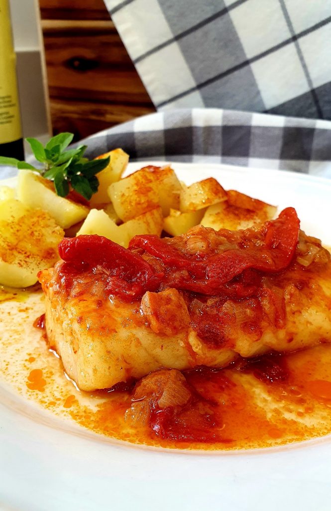 BACALAO A LA VIZCAÍNA – ESPECIAL CUARESMA. Ingredientes: 50 ml de aceite de oliva, 4 dientes de ajo, 2 cebollas tiernas, 1 rebanada de pan, 3 pimientos choriceros, 4 cucharadas de tomate natural triturado, Sa,, 450 ml de caldo de pescado o agua, 800 gr de lomos de bacalao desalado. Para acompañar: patatas cocidas aliñadas con aceite de oliva, pimentón y sal en escamas.