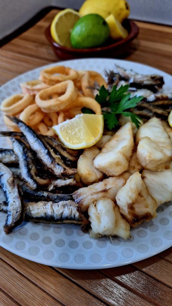 COCINAPrimeros Bandeja de pescaíto frito agosto 7, 2023 Pedro RECETAS DE VERANO: PESCAÍTO FRITO para disfrutar como en las terrazas de verano. Ingredientes: 750 gr de calamares, 500 gr de merluza, 500 gr de boquerones, harina, sal, limón, aceite de oliva para freír. Ensaladilla rusaPatatas aliñás de Cádiz