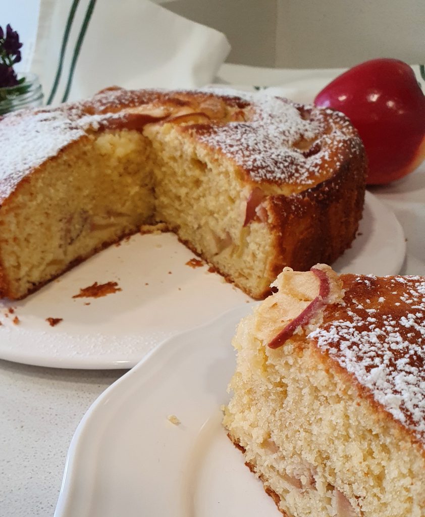 Bizcocho de manzana con queso Mascarpone realmente impresionante. Un bizcocho muy esponjoso con un sabor que es un lujo para el paladar 😉 Ingredientes: 4 huevos 4 manzanas 200 gr. de azúcar 250 gr. de queso Mascarpone 200 gr. de harina 1 sobre de levadura química (polvos de hornear) 1/2 cucharadita de canela en polvo (opcional) Azúcar glass Mantequilla para engrasar el molde Molde de 22-24 centímetros.