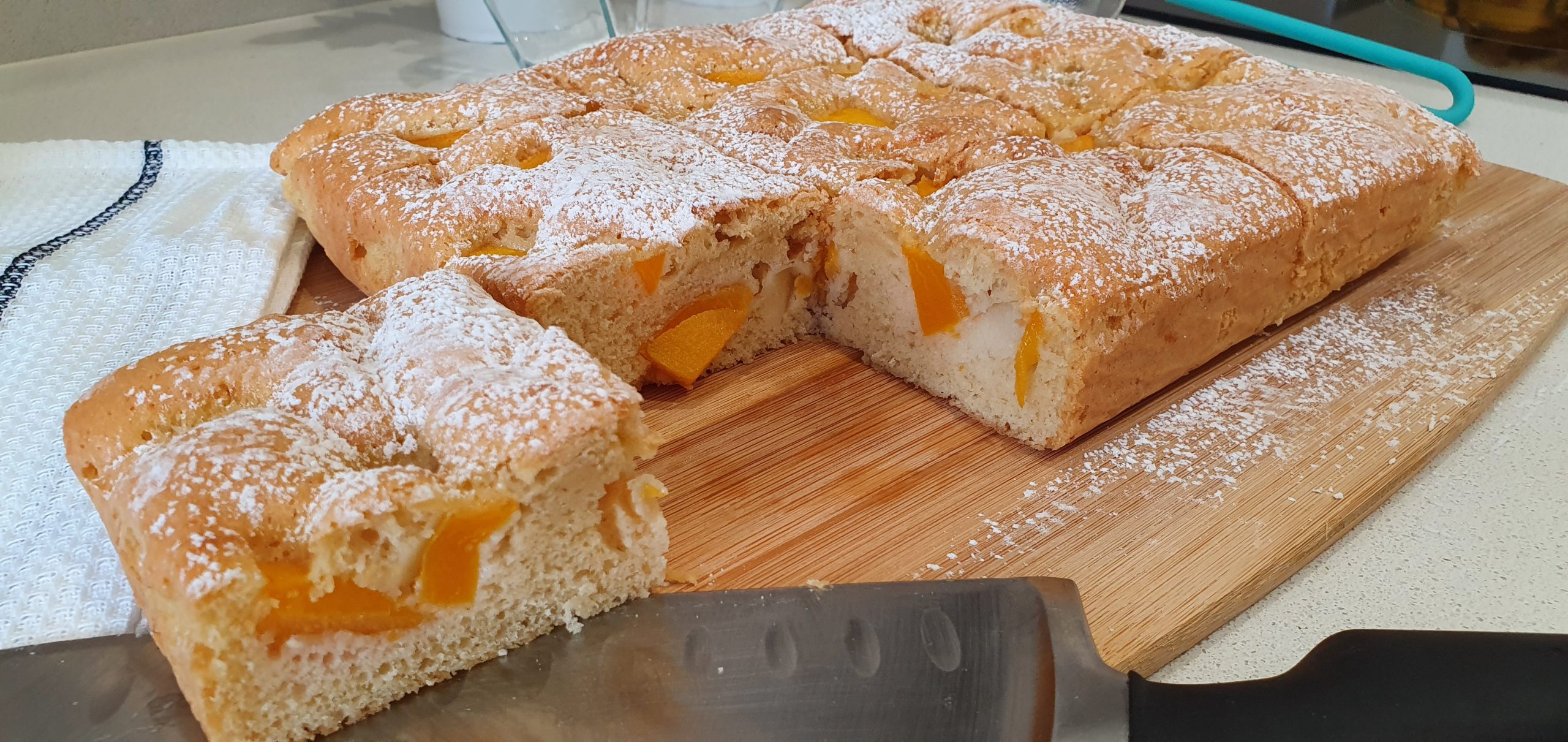 BIZCOCHO DE MELOCOTÓN perfecto para la merienda o el desayuno. Lo preparamos en cinco minutos y al horno. Sin complicaciones. Ingredientes: 3 melocotones, 4 huevos, 160 gr. de azúcar, 200 gr. de harina, un sobre de azúcar avainillada (1 cucharadita), 10 gr. de levadura química y azúcar glasse.