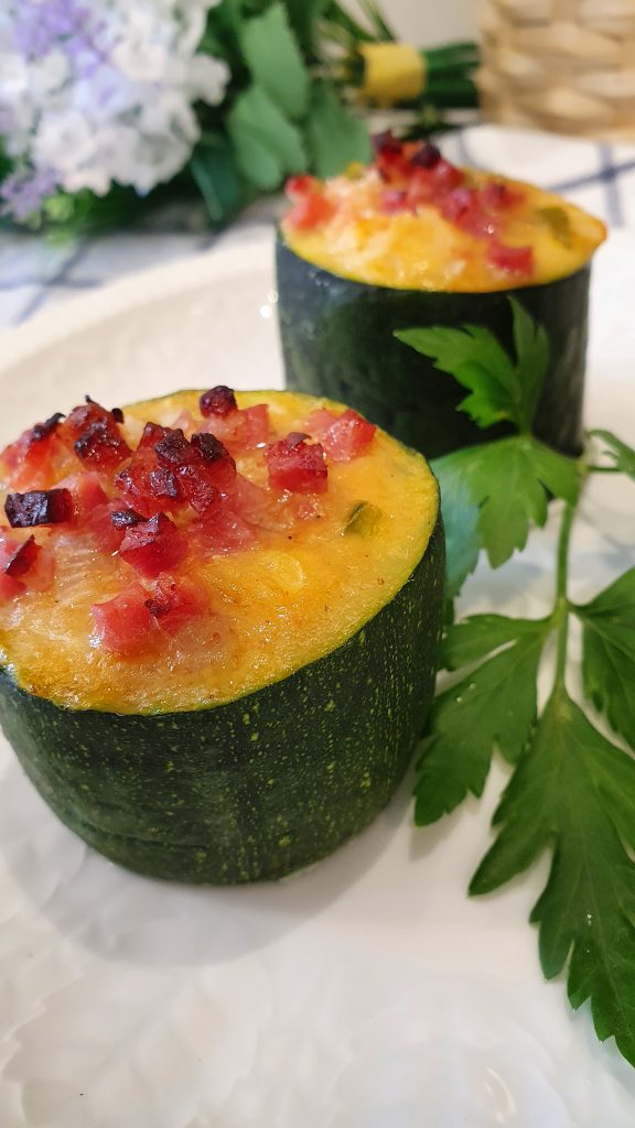 Calabacines rellenos de verduras y jamón serrano. Ingredientes: 3 calabacines, 1 cebolla, 1 pimiento verde, 1 tomate, 2 huevos, 125 gr de jamón serrano en taquitos, 50 gr de queso rallado, 2 cucharadas de pan rallado, Aceite de oliva, Sal, pimienta y comino.