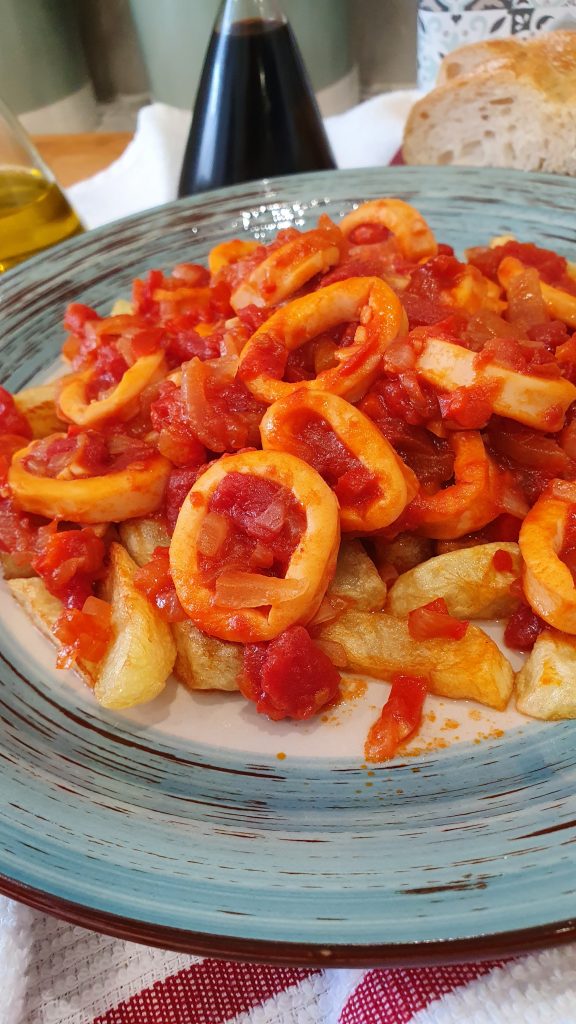 COCINASegundos Cazuela de calamares en salsa con un toque picante mayo 29, 2021 Pedro Cazuela de calamares en salsa con un toque picante. Ingredientes: 1 kg de calamares, 2 cebollas, 1 pimiento rojo, 3-4 dientes de ajo, 800 gr de tomates pelados en conserva, 1 guindilla, 40 ml. de brandy, 3 patatas, Aceite de oliva y sal. Ensaladilla rusaPatatas aliñás de Cádiz