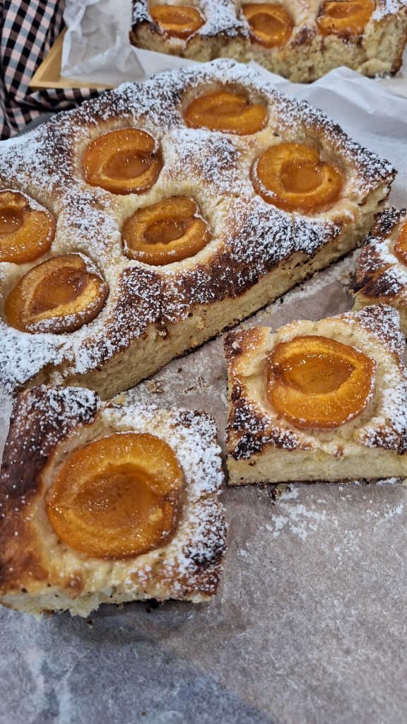 COCA DE PATATA Y ALBARICOQUE típica de las Islas Baleares. Ingredientes: 500 gr de harina de fuerza, 3 huevos, 8 albaricoques, 25 gr de levadura fresca, 100 ml de aceite de girasol, 50 gr de manteca, 200 gr de azúcar, 100 ml de leche tibia, 170 gr de patata cocida, Molde de 36 x 24 cm.