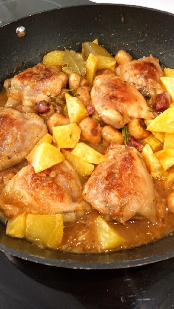 Contramuslos de pollo al cava con cebolla caramelizada y champiñones a las finas hierbas !!! Ingredientes: Para el pollo: 6 contramuslos de pollo, sal, pimienta, 60 ml de aceite de oliva, 2 cebollas tiernas, 2 dientes de ajo, una cucharada de azúcar moreno, 200 ml de cava o vino blanco, el zumo de un limón y un poquito de agua. Para las patatas: 2 patatas, 6-8 dientes de ajo, 2 hojas de laurel y aceite para freír. Para los champiñones: 250 gr de champiñones, 50 gr de mantequilla, sal y pimienta, un chorrito de aceite de oliva, romero y tomillo.