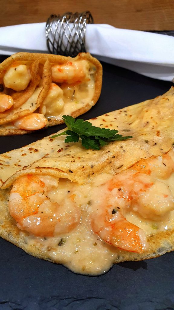 Perfecto para FIESTAS Y NAVIDAD. Crepes rellenos de langostinos y crema !!! Ingredientes: 200 ml de leche, 80 gr de harina, 2 huevos, 800 gr de langostinos, 1 cebolla tierna, 1 diente de ajo, 40 ml de whisky, 200 ml de nata para cocinar (crema de leche), finas hierbas, aceite de oliva, sal y pimienta.