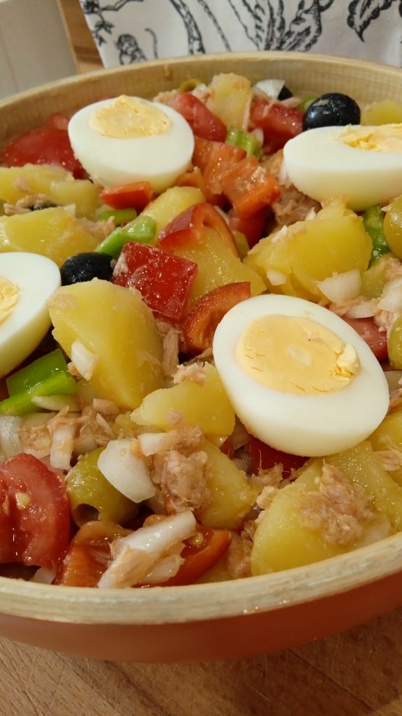 COCINAPrimeros Ensalada campera septiembre 11, 2022 Pedro ENSALADA CAMPERA. Ingredientes: 800 gr de patatas, 3 huevos, 1/2 pimiento rojo, 1/2 pimiento verde, 2 tomates, 1/2 cebolla tierna, 2 latas de atún, aceitunas negras, aceitunas verdes, Sal, 80 ml de aceite de oliva, 20 ml de vinagre. Ensaladilla rusaPatatas aliñás de Cádiz
