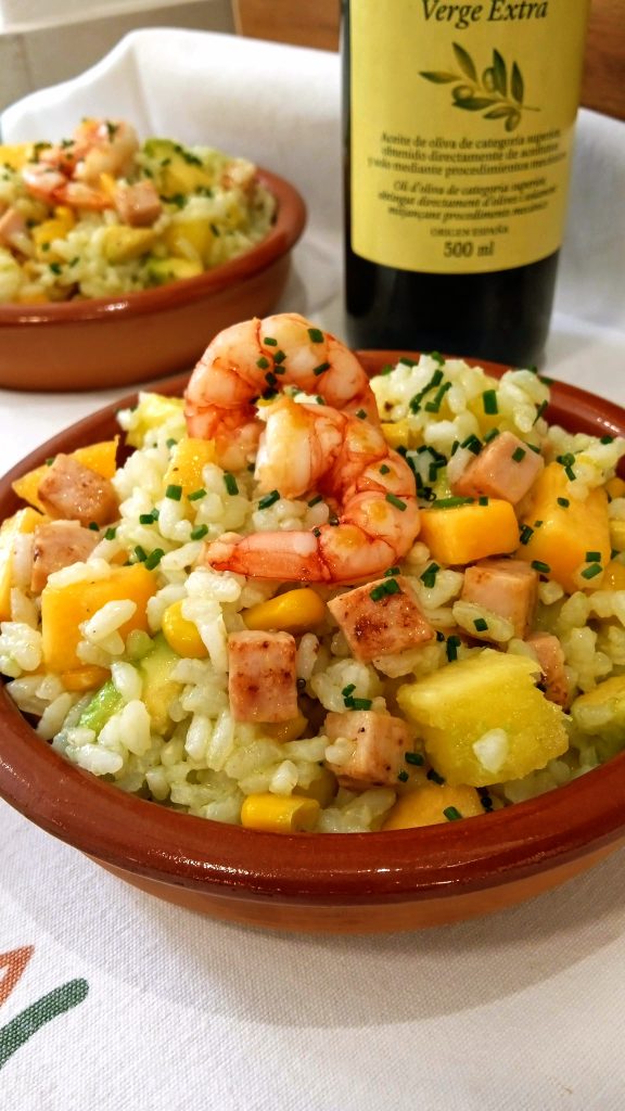COCINAPrimeros Ensalada de arroz tropical septiembre 3, 2022 Pedro ENSALADA DE ARROZ TROPICAL. Ingredientes: 200 gr de arroz, 8 gambas o langostinos, 100 gr de pavo o jamón cocido, 1 melocotón, 1 aguacate, 2 rodajas de piña, 50 gr de maíz, 60 ml de aceite de oliva, el zumo de medio limón, sal y pimienta. Ensaladilla rusaPatatas aliñás de Cádiz