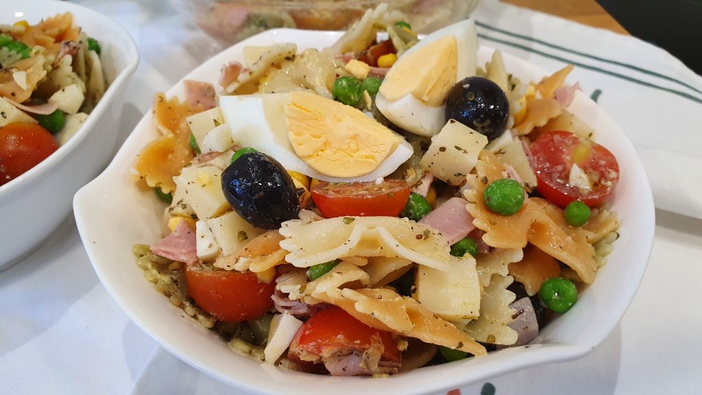 Ensalada de pasta con jamón y queso. Ingredientes: 3 huevos, 200 gr de pasta, 50 gr guisantes congelados, 50 gr de maíz, 100 gr de jamón cocido, 12 tomates cherrys, Aceitunas negras, 1 cucharadita de albahaca y 1 de orégano, 50 ml de aceite de oliva, 15 ml de vinagre de Jerez, Sal y pimienta.