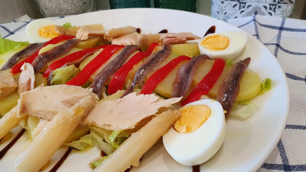 COCINAPrimeros Ensalada de patatas con bonito y anchoas junio 21, 2021 Pedro Ensalada de patatas con bonito y anchoas. Ingredientes: 2-3 patatas pequeñas, 4 huevos, Lechuga, 2 pimientos del piquillo, 1 lata pequeña de anchoas, 2 lomos de bonito, Espárragos blancos, Crema de vinagre balsámico, Sal y aceite de oliva. Ensaladilla rusaPatatas aliñás de Cádiz