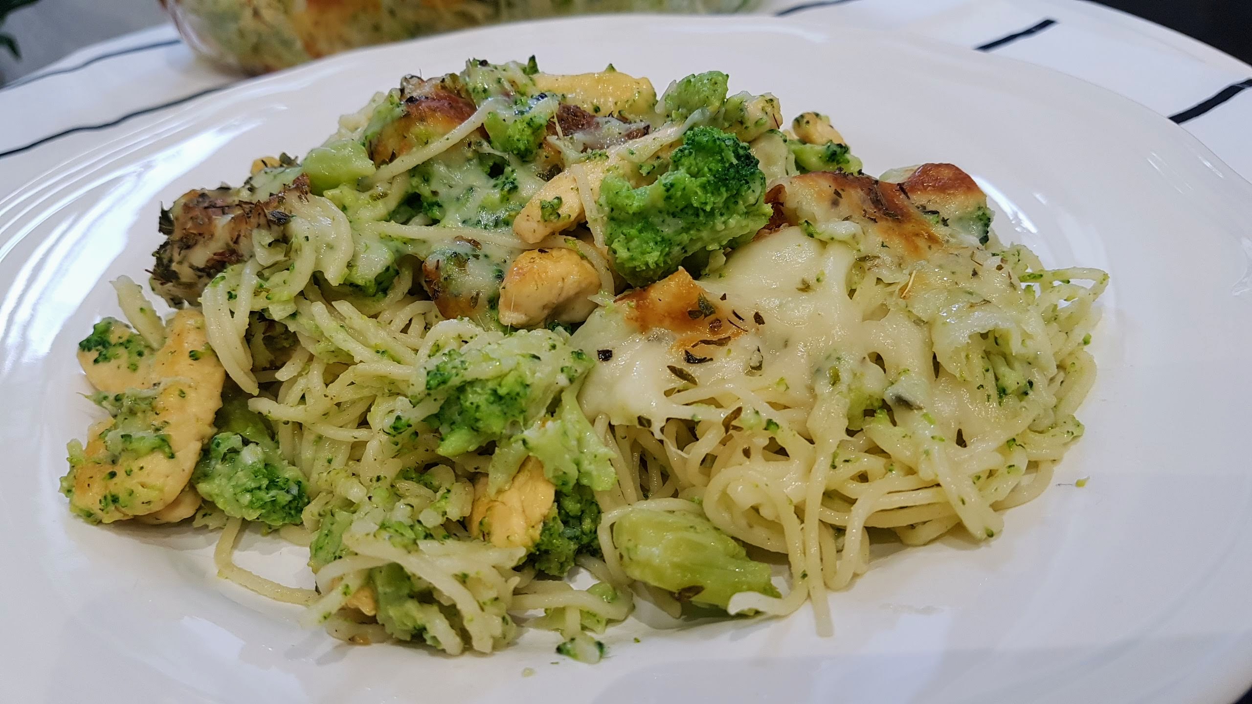 Ingredientes: 3 filetes de pollo, 240 gr. de espaguetis, 250 gr. de brócoli, 200 gr. de queso mozzarella rallado, 2 dientes de ajo, aceite de oliva, sal, pimienta y orégano.