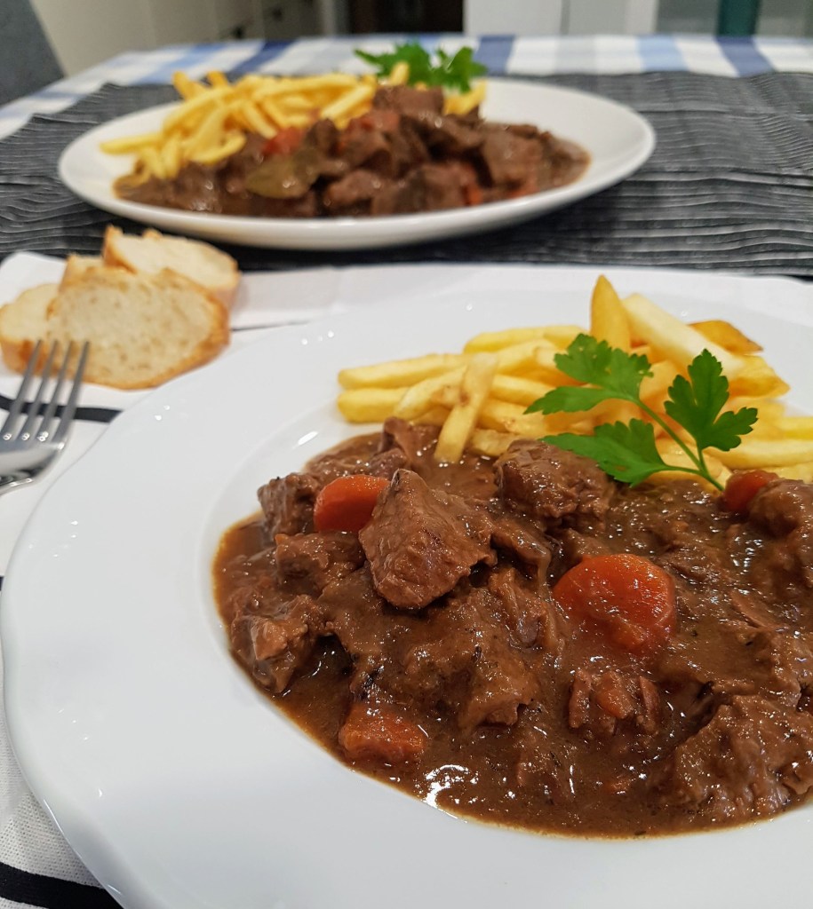 Estofado belga de ternera, llamado carbonade flamande. Un guiso a base de ternera y cebolla cocinado con cerveza y especiado con tomillo y laurel parecido al boeuf borguingon francés o incluso a nuestro estofado de ternera al vino tinto