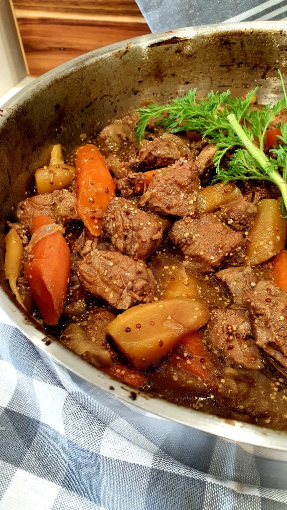ESTOFADO DE TERNERA ESTILO JAMIE OLIVER tan tierno y jugoso que se derrite en la boca. Ingredientes: 1 kg de carne de ternera para guisar, 500 gr de zanahorias, 500 gr de cebolla, 120 ml de salsa Worcestershire, 2 cucharadas de mostaza a la antigua, 500 ml de agua, Aceite de oliva, sal y pimienta.
