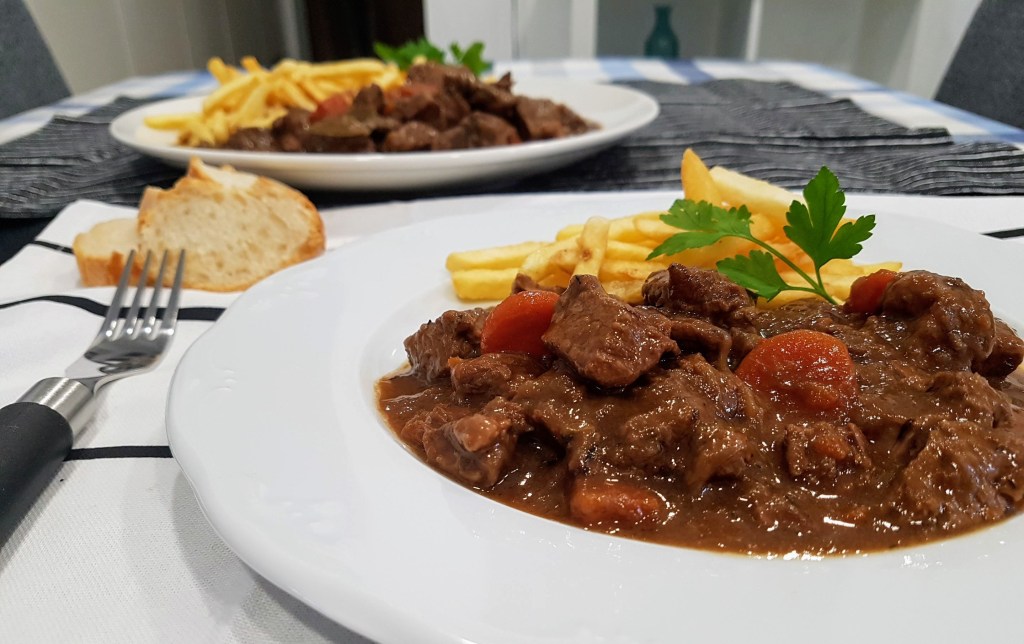 El plato que más nos ha gustado ha sido el estofado belga de ternera, llamado carbonade flamande. Un guiso a base de ternera y cebolla cocinado con cerveza y especiado con tomillo y laurel parecido al boeuf borguingon francés o incluso a nuestro estofado de ternera al vino tinto