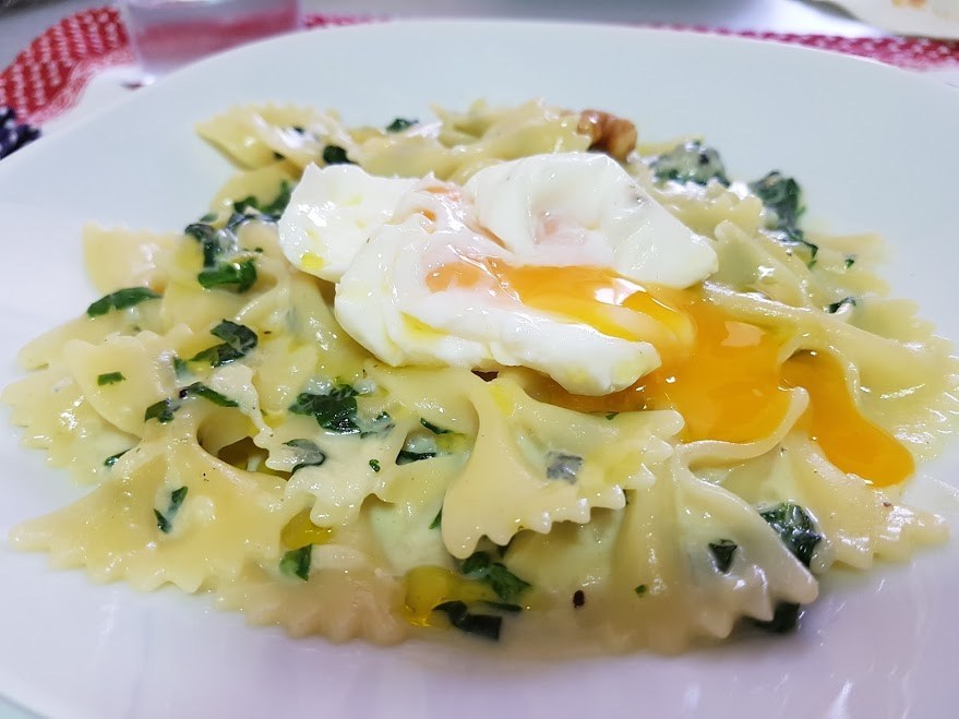 Vamos a preparar unos lazos o mariposas que los italianos llaman farfalle. Los haremos a la crema de queso con unas espinacas. Un estupendo plato de diario que tendremos listo en unos 20-25 minutos. El queso elegido es el Gorgonzola, el queso azul más conocido en Italia. Culminaremos con unas nueces y un huevo escalfado o poché que hará que tu plato enamore a toda la familia o amigos.