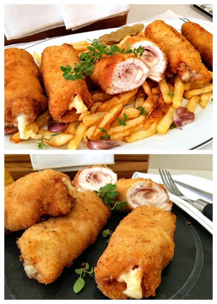 FLAMENQUINES DE POLLO rellenos de jamón y queso. Los niños te los quitarán de los manos y los grandes también !!! Ingredientes: Pechugas de pollo en filetes finos, Jamón cocido, Queso en lonchas, 2 huevos, pan rallado, sal, aceite de oliva para freír. Acompañamos con patatas fritas.