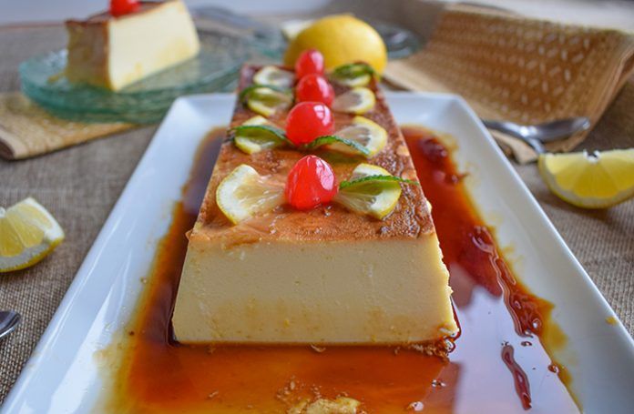 Tiene un delicioso sabor a limón y, al llevar entre sus ingredientes yogur y leche condensada, queda una textura suave pero consistente, un intermedio entre el clásico flan de huevo y un pudin.