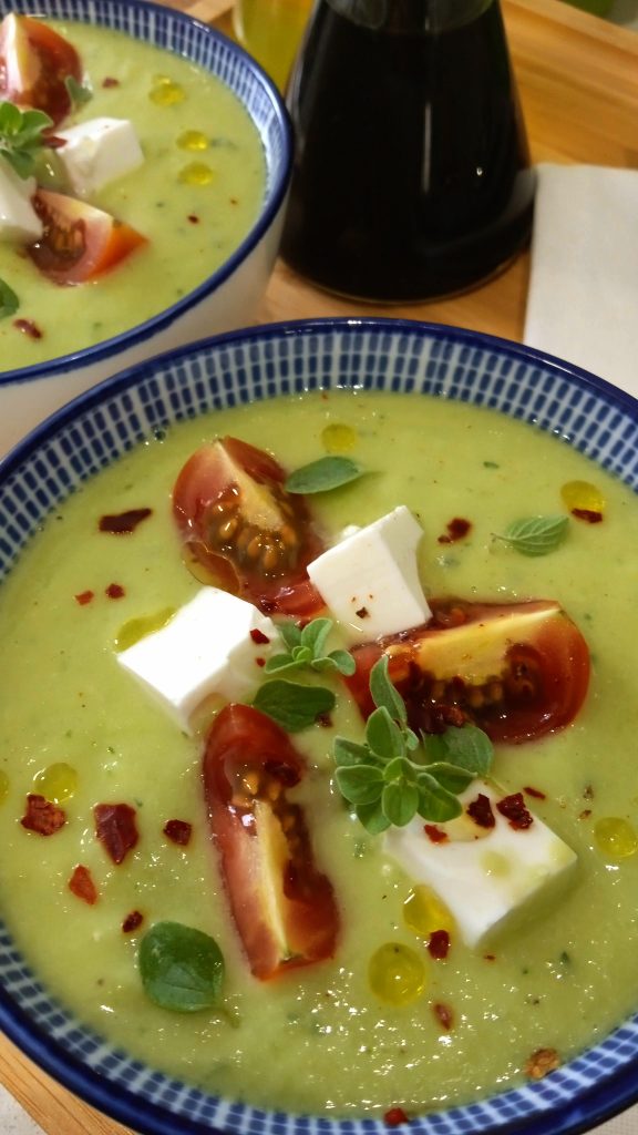 Gazpacho de aguacate en 10 MINUTOS. Ingredientes: 250 g de pepino, 70 g de cebolla, 1/2 pimiento verde italiano, 1 diente de ajo, 2 aguacates grandes, Zumo de medio limón, 20 ml de vinagre, 40 ml de aceite de oliva, 1 cucharadita de sal, pimienta negra, 2 cubitos de hielo triturados, 200 ml de agua muy fría, Para la decoración: Dados pequeños de queso fresco, Tomates cherry, Unas hojas pequeñas de orégano, albahaca o tomillo, Aceite de oliva virgen extra, pimentón en escamas.