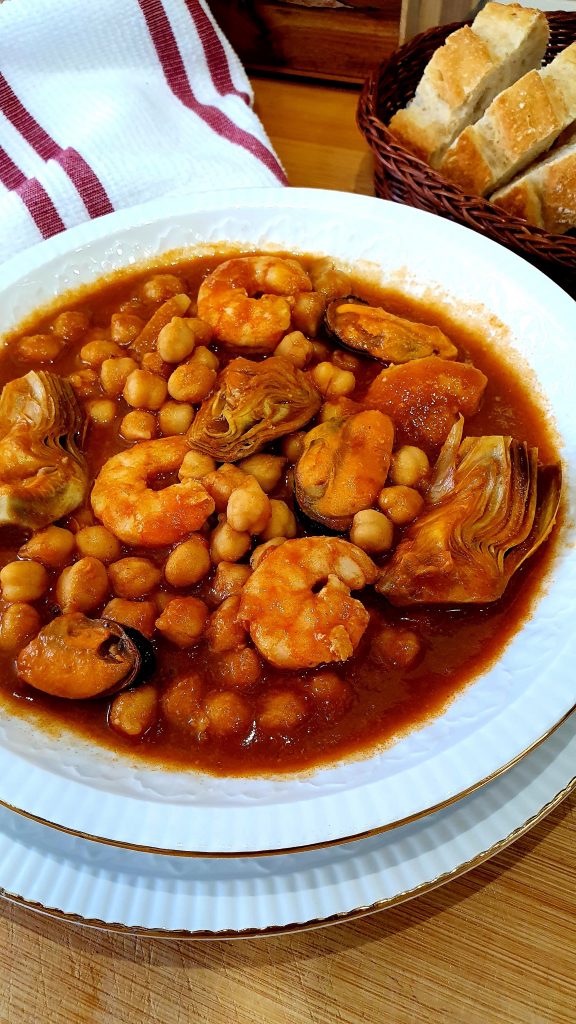 Guiso de garbanzos con langostinos y alcachofas