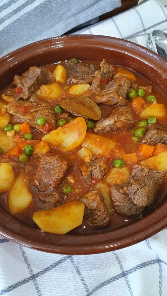 Guiso de PATATAS Y CARNE – PLATO ÚNICO: Ingredientes: 800 gr de carne de ternera para guisar, 1 cebolla, 1/2 pimiento verde, 2 zanahorias, 2 dientes de ajo, 2 hojas de laurel, 1 cucharadita generosa de pìmentón, 2 cucharadas de tomate concentrado, 200 ml de vino blanco, 1 kg de patatas, 1 litro de caldo de carne, 100 gr de guisantes congelados, Aceite de oliva y sal.