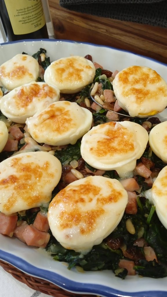 Huevos con espinacas a la florentina. INGREDIENTES: 6 huevos, 600 gr de espinacas, 1 cebolla tierna, 100 gr de fiambre de pavo, un puñado de pasas y piñones, sal y aceite de oliva. Para la bechamel: 10 gr de mantequilla, aceite de oliva, 500 ml de leche, 1 cucharadita de mostaza, sal, pimienta y nuez moscada.