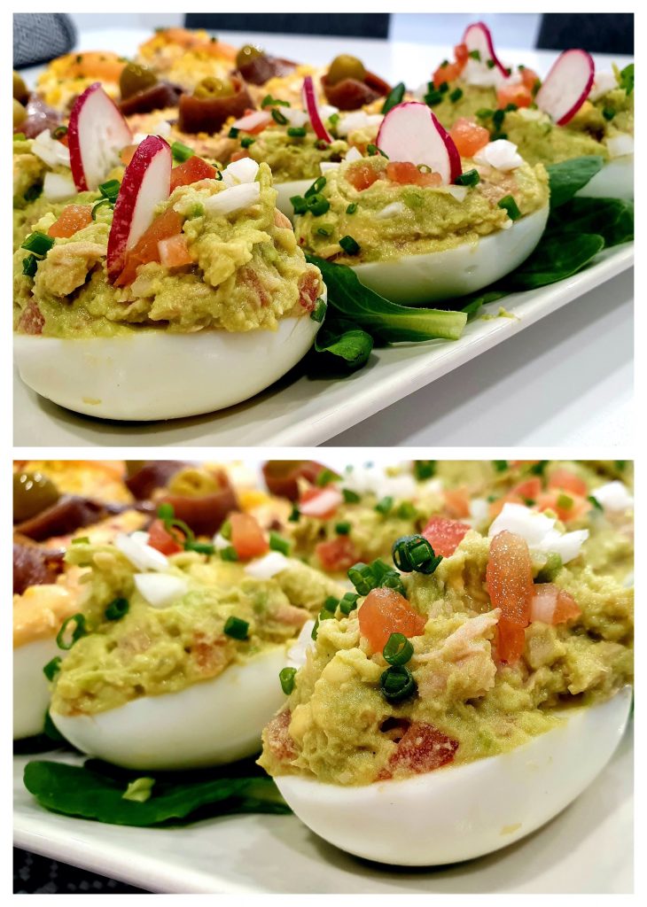 COCINAEntrantesPrimeros Huevos rellenos de aguacate junio 24, 2022 Pedro HUEVOS RELLENOS DE AGUACATE: 4 huevos. 1 aguacate. 1/2 tomate. 1/4 cebolleta tierna. 1 lata de atún. El zumo de medio limón. Sal y un par de rabanitos. Ensaladilla rusaPatatas aliñás de Cádiz