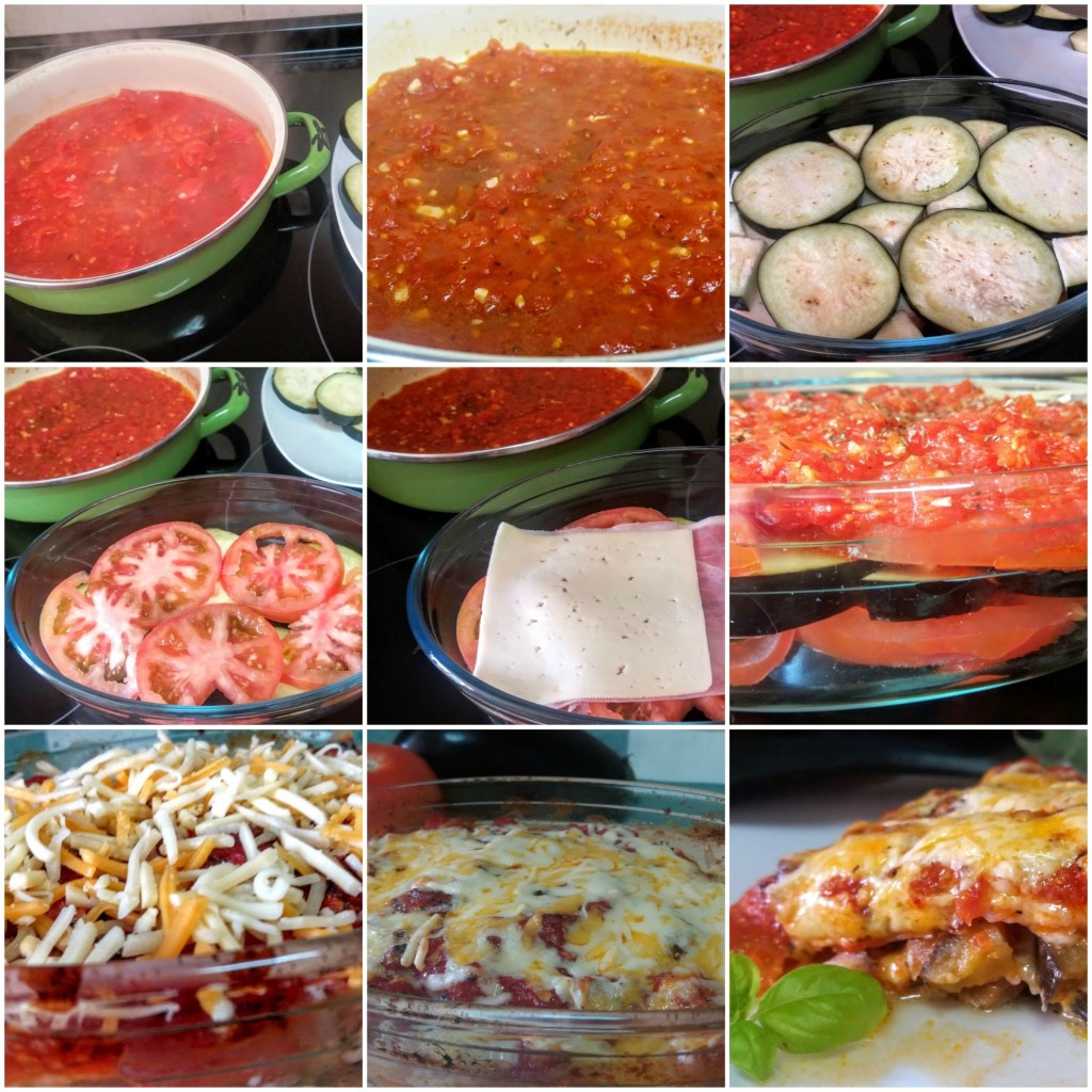 1 berenjena grande, 2 tomates (opcional), lonchas de queso Havarti, lonchas de jamón york, queso rallado. Para la salsa de tomate: 6 tomates (hemos utilizado un bote de tomates ya pelados), una cucharada de aceite de oliva, 2 dientes de ajo, sal y hierbas provenzales. En caso de no tener a mano hierbas provenzales puedes usar orégano, tomillo o romero.