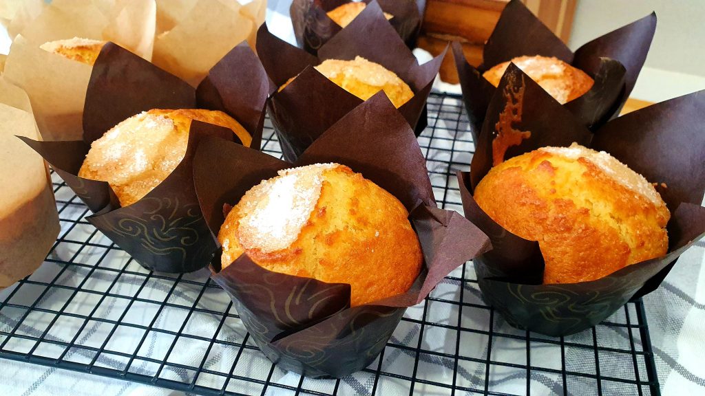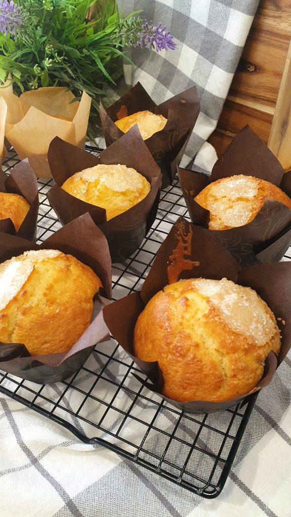 Ingredients: 4 eggs, 150 g of sugar, the zest of a lemon, 1 yogurt, 1 Teaspoon vanilla extract, 60 ml of milk, 80 ml of melted butter, 60 ml of sunflower oil, 300 grams of flour, 16 gr of chemical yeast (baking powder), A pinch of salt, Sugar to sprinkle the cupcakes.
