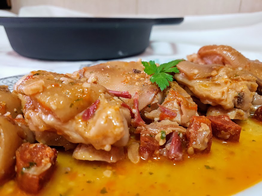 Venimos hoy con una receta tradicional de esas que quitan el “sentío”, de las que está permitido comer con las manos y rechupetearse los dedos: unas manitas de cerdo con chorizo. Y si las manitas están ricas, la salsa ni te cuento. Para no para de mojar pan.