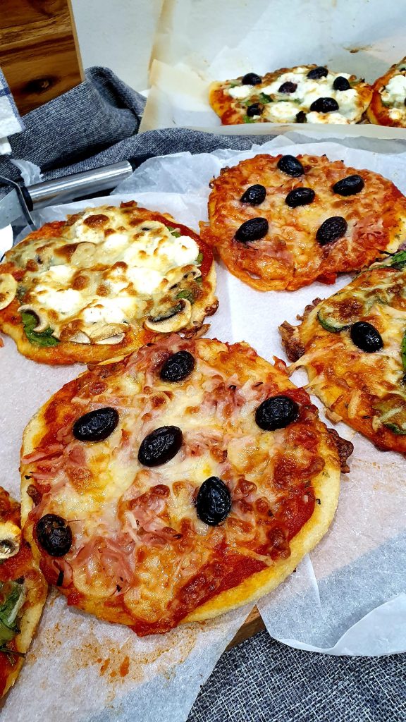 Mini pizzas de sémola de trigo. Ingredientes: Para la masa: 180 gr de harina de fuerza, 180 gr de sémola o harina de trigo duro, 1 cucharadita de sal, 1 cucharadita de azúcar, 25 gr de levadura fresca, 1 cucharadita de orégano, 250 ml de agua tibia, 2 cucharadas de aceite de oliva.