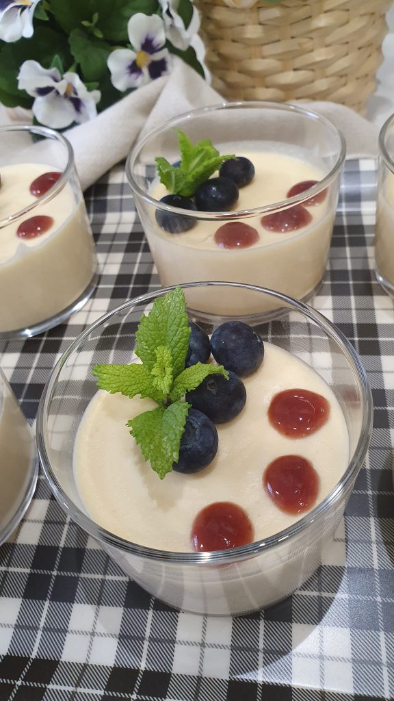 Mousse de chocolate blanco con salsa de arándanos. Ingredientes: 130 gr de chocolate blanco, 4 huevos, 2 hojas de gelatina, 50 ml de vino dulce, 200 ml de nata (crema de leche) 35 % materia grasa, 60 gr de mantequilla, Para la salsa: 100 gr de arándanos, el zumo de medio limón y 25 gr de azúcar.