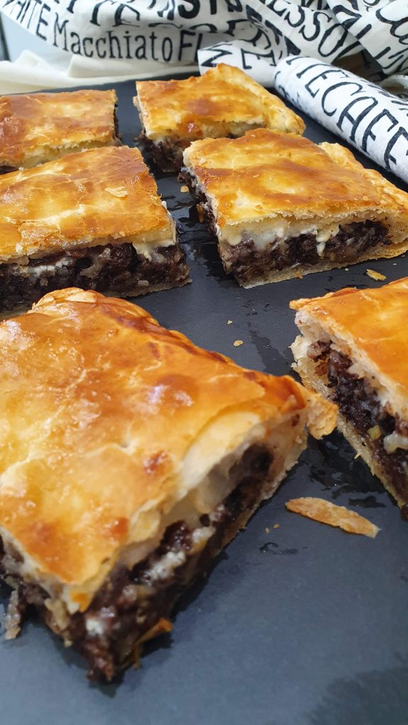 TODOS TE PEDIRÁN MÁS – Pastel de morcilla con queso de cabra y cebolla caramelizada. Ingredientes: 1 lámina de hojaldre, 350 gr de cebolla tierna, 300 gr de morcilla de Burgos, 180 gr de queso de cabra, un puñado de pasas, sal, 40 ml de aceite de oliva.