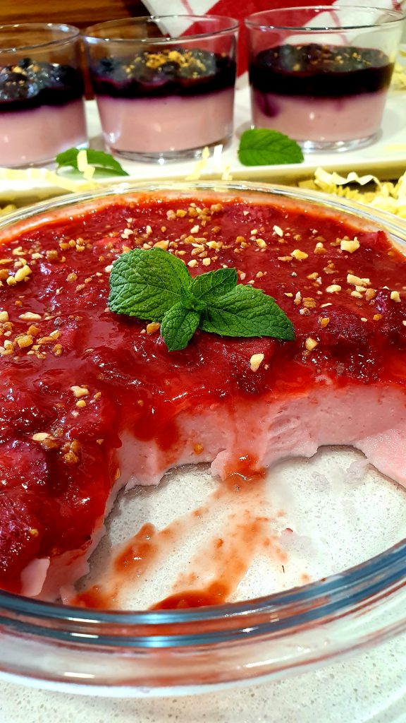 Postre casero de fresa en 10 MINUTOS SIN HORNO, SIN GELATINA. Ingredientes: 250 gr de fresas, 80 gr de azúcar, 600 ml de leche, 50 gr de maicena. Para la cobertura: 250 gr de fresas, 60 gr de azúcar y 20 gr de mantequilla. Opcional 200 gr de arándanos.