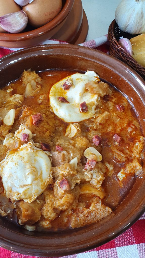 Sopa de ajo en colorao EN 5 MINUTOS !!! Ingredientes: 60 ml de aceite de oliva, 1/2 barra de pan en rebanadas tostadas, 7 dientes de ajo, 1 cucharadita generosa de pimentón, 2 cucharadas soperas grandes de tomate frito, 1250 ml de caldo de pollo o cocido, 100 gr de chorizo en taquitos.