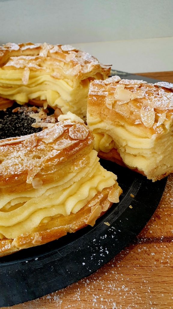 Tarta de crema PARÍS BREST. Ingredientes para la crema: 2 huevos, la piel de un limón, 150 gr de azúcar, 70 gr de Maizena, 500 ml de leche, 160 gr de mantequila. Para la masa: 150 gr de harina, 100 gr de mantequilla, 3 huevos, 250 ml de agua, 5 gr de azúcar, una pizca de sal.