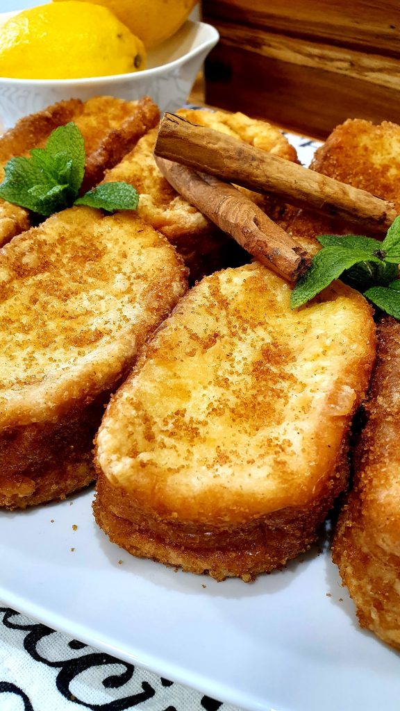 Torrijas de MARTÍN BERASATEGUI. Ingredientes: 1/2 litro de leche, 1/4 litro de nata líquida, 110 gramos de azúcar, 1 ramita de canela, 1 barra de pan (brioche para torrijas) o una barra de pan normal, harina, 1 limón, 2 huevo, Aceite de oliva o de girasol para freír, Azúcar moreno, Canela molida,