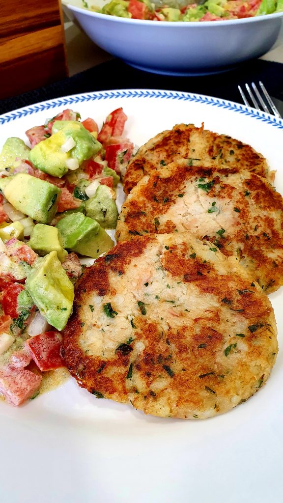 TORTITAS DE ATÚN Receta de VERANO fresca y saludable. Ingredientes: 600 gr de patatas, 200 gr de atún en conserva, sal, pimienta, perejil, 1 huevo, 1/2 cebolla tierna, 40 gr de pan rallado. Para la ensalada: 2 aguacates, 1 tomate, 1/2 cebolla tierna, 2 cucharadas de jugo de limón, orégano, sal, pimienta, 1 cuchara de mayonesa y 4 cucharadas de aceite de oliva.