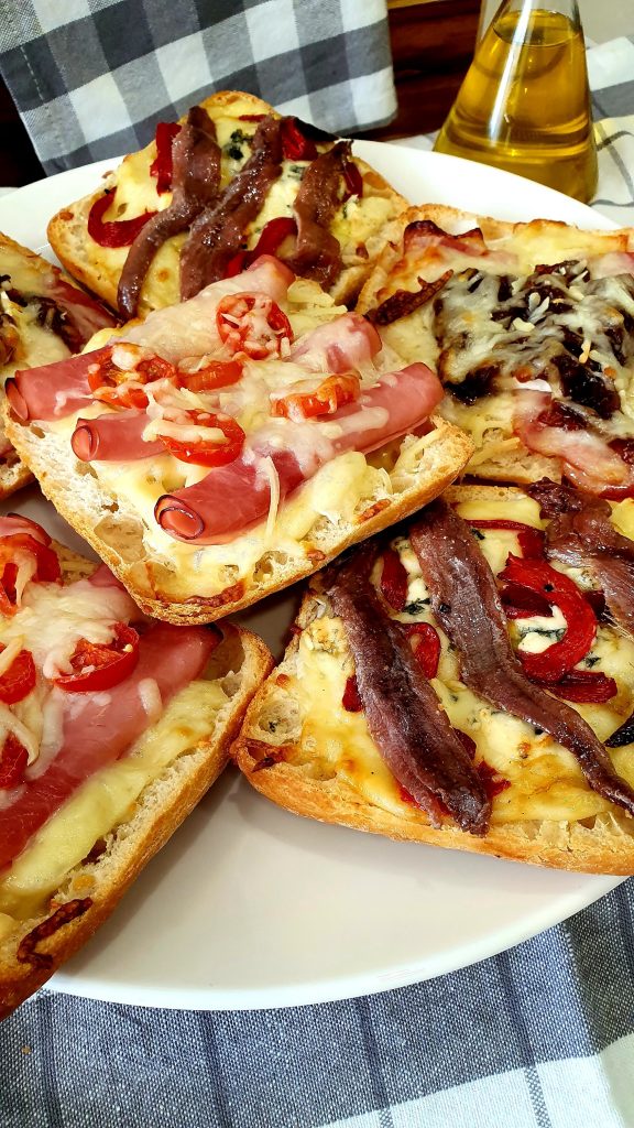 TRÍO DE TOSTAS EN 10 MINUTOS para cenas rápidas. Tosta de bacon: cebolla, mozarella, bacon, queso de cabra y cebolla caramelizada. Tosta de anchoas: cebolla, mozarella, queso de Mahón, queso azul, pimientos del piquillo, y anchoas. Tosta de jamón cocido: cebolla, mozarella, queso de Mahón, jamón cocido y tomates cherry.